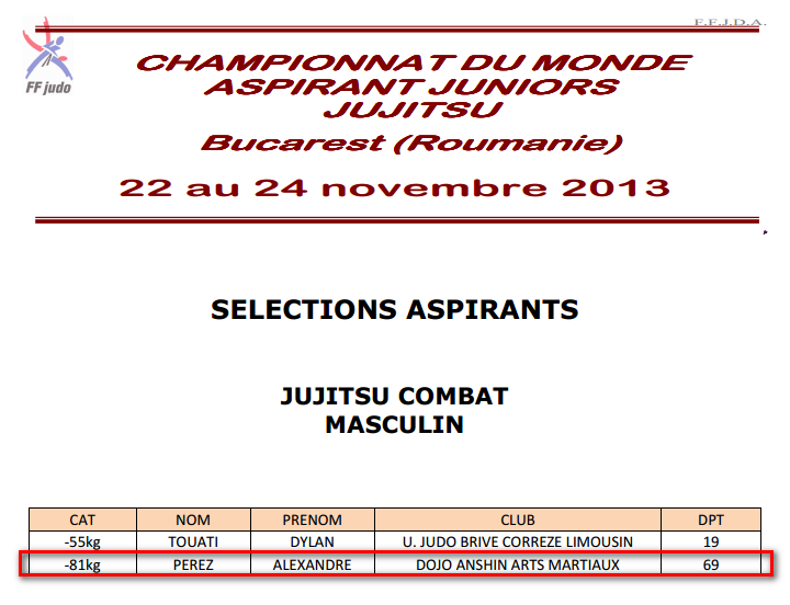 Alexandre PEREZ, sélectionné en équipe de France pour les championnats du monde de jujitsu combat, – de 18 ans, en Roumanie.